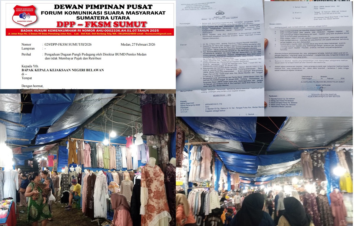 Topmetro.co, Medan I Pengelola Pasar Komersil bernama Bazar UMKM Medan Utara dilaporkan Pengurus Forum Komunikasi Suara Masyarakat (FKSM) Sumut ke Kejari Belawan atas dugaan pungutan liar dan tak membayar Pajak dan Retribusi ke Negara. Laporan itu disampaikan Ketua Umum FKSM Sumut, Senin (2/3/2026) via daring dan akan disampaikan secara langsung ke PTSP Kejari Belawan pada Selasa 3 Maret 2026.